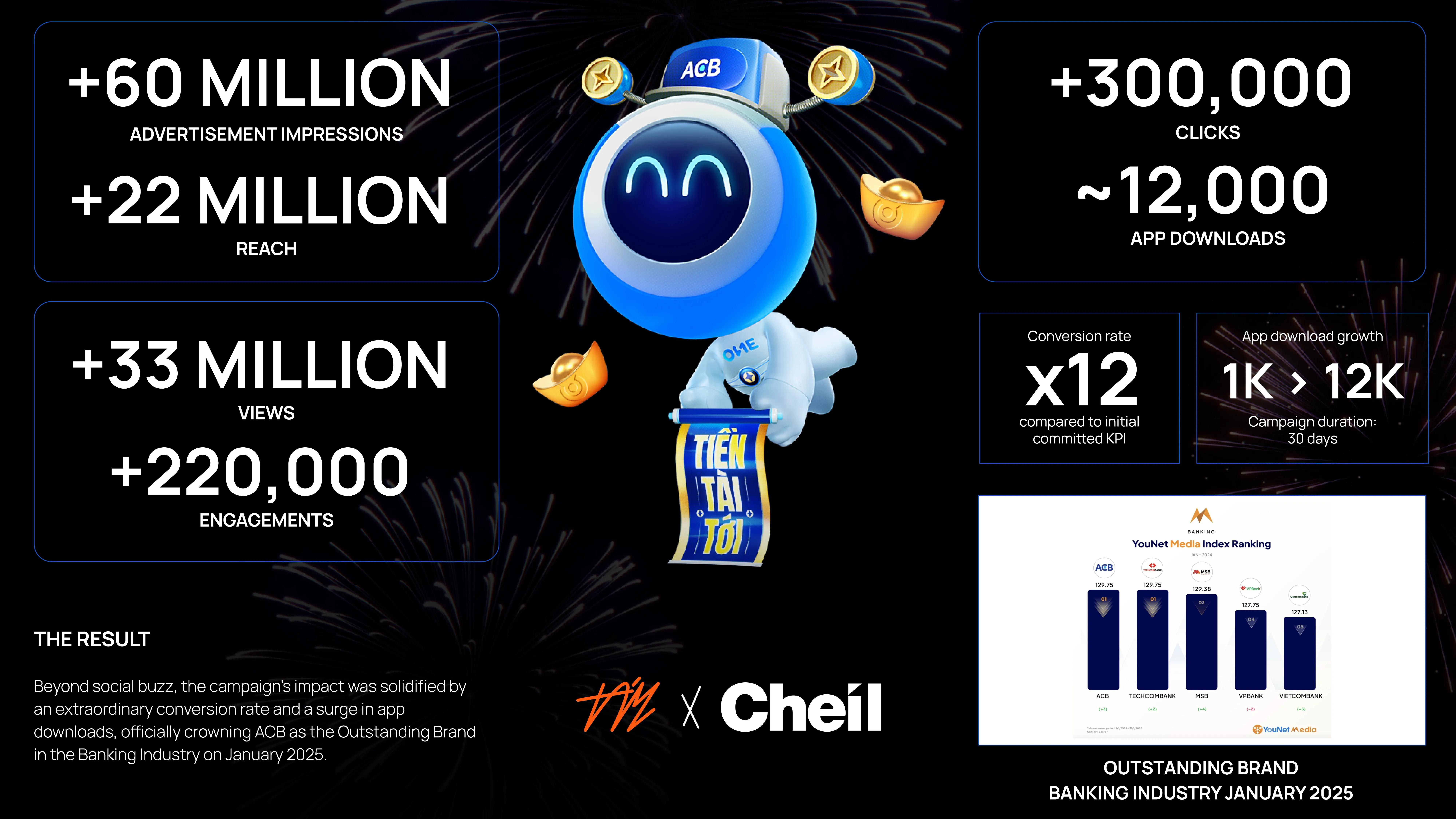 Beyond social buzz, the campaign’s impact was solidified by an extraordinary conversion rate and a surge in app downloads, officially crowning ACB as the Outstanding Brand in the Banking Industry on January 2025.